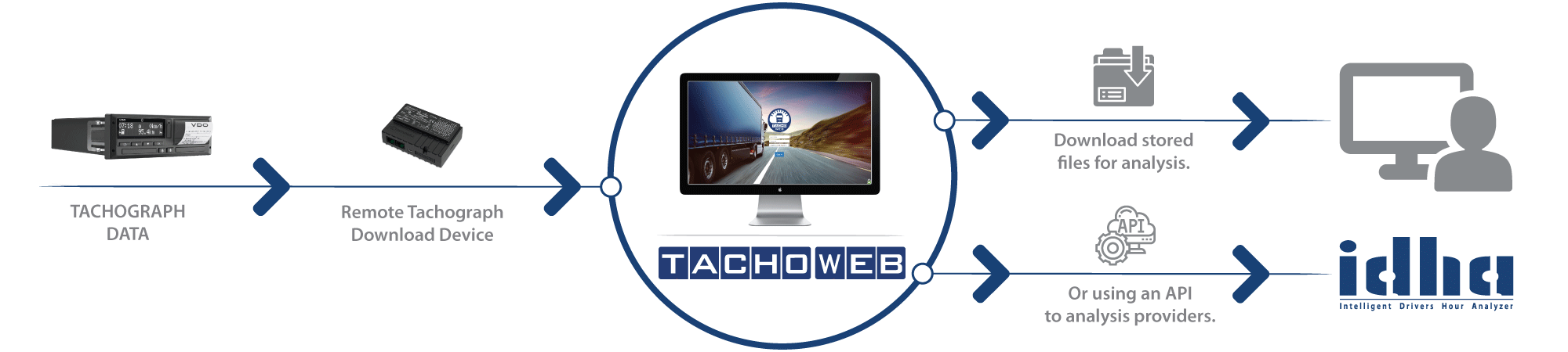 The data is then sent over the internet to our secure servers where you can download the .ddd files for analysis this solution saves manually downloading tachograph units and driver cards.